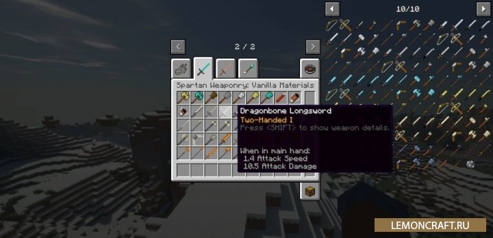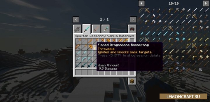 Мод на спартанское оружие Spartan and Fire является небольшим аддоном, который позволит объединить два мода Ice and Fire и Spartan Weaponry. В итоге вы сможете создать новое оружие, которое уже есть в моде Spartan Weaponry, но из материалов, которые используются в моде Ice and Fire. В итоге полученное оружие будет более мощным и его характеристики улучшаться по сравнению с обычным оружием из мода Spartan Weaponry.