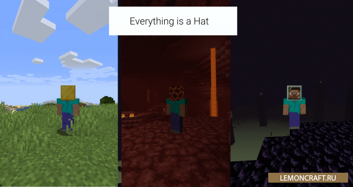 Мод на оригинальный головной убор Everything is a Hat немного юмористический мод, который позволит вам надеть на голову совершенно любой блок из игры. Для того, что бы надеть блок на голову, его нужно перетащить в специальный слот инвентаря, который добавит этот мод.