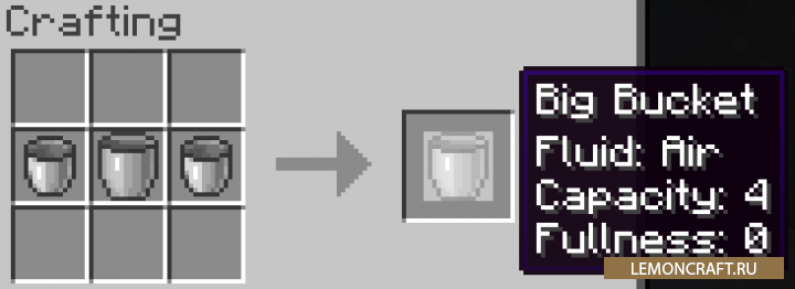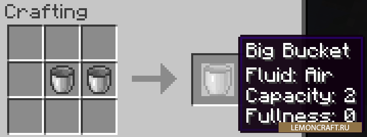 Мод на большие ведра BigBuckets добавляет в игру ведра большой емкости и возможность их совмещения друг с другом. Теперь вы сможете собирать жидкость в 2 или 4 раза больше чем в обычное ведро. Ведра можно улучшать путем объединения нескольких ведер. Для этого достаточно совместить два ведра в сетке крафта и большое ведро готово к использованию.