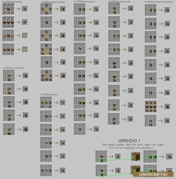 Мод на мебель в ванильном стиле Macaw's Furniture добавит в игру новые блоки, которые позволят вам обустроить интерьер вашего строения. В основном мод добавляет шкафы (двухстворчатые, низкие, высокие, с ящиками, с книжной полкой). Всего будет добавлено около 30 видов новой мебели. Главным плюсом данного мода, является то, что автор постарался максимально приблизить всю фурнитуру к ванильному майнкрафту. В результате новые блоки отлично вписываются в стандартные текстуры и хорошо сочетаются со стандартными блоками.