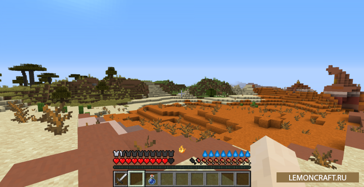 Мод на жажду Dehydration добавляет в игру такое понятие, как жажда, в результате чего вам периодически нужно будет ее утолять водой. В пустынных биомах, где жарко, жажда больше, соответственно имейте в запасе больше воды. Для уменьшения жажды можно снять броню.