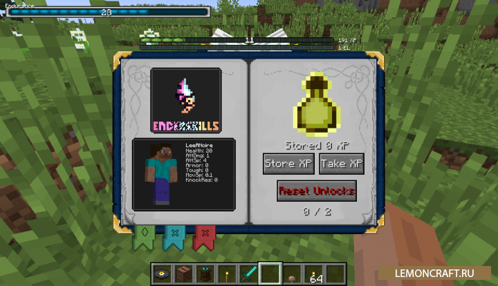 Мод на прокачку навыков Ender Skills довольно интересная модификация, которая позволит вам изучить мощные заклинания с отличной анимацией, а так же прокачать навыки, что пригодится при проведении PvP и PvE боях. Новые заклинания имею некоторое время на восстановление, поэтом не стоит пренебрегать в боях таким оружием, как лук и меч.