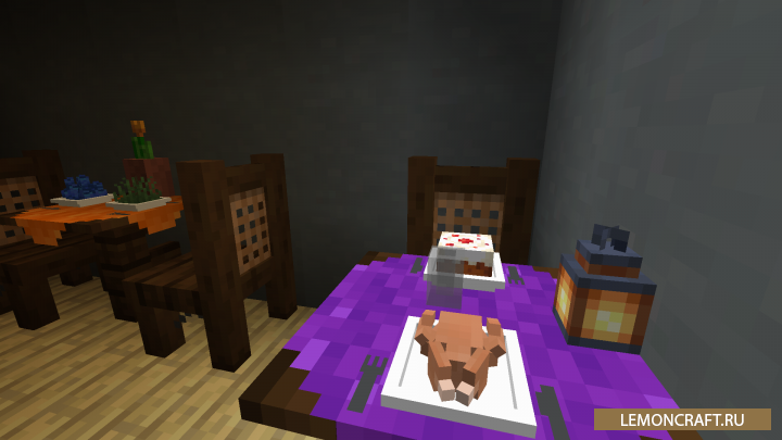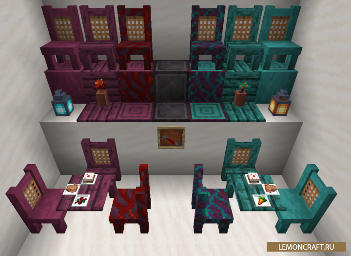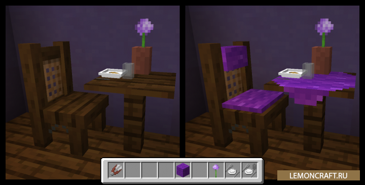 Мод на мебель TableChair позволит вам создавать столы и стулья из ванильных материалов. Сам стол вы сможете украсить, установить на него вазу с цветами или разместить на нем свою еду.